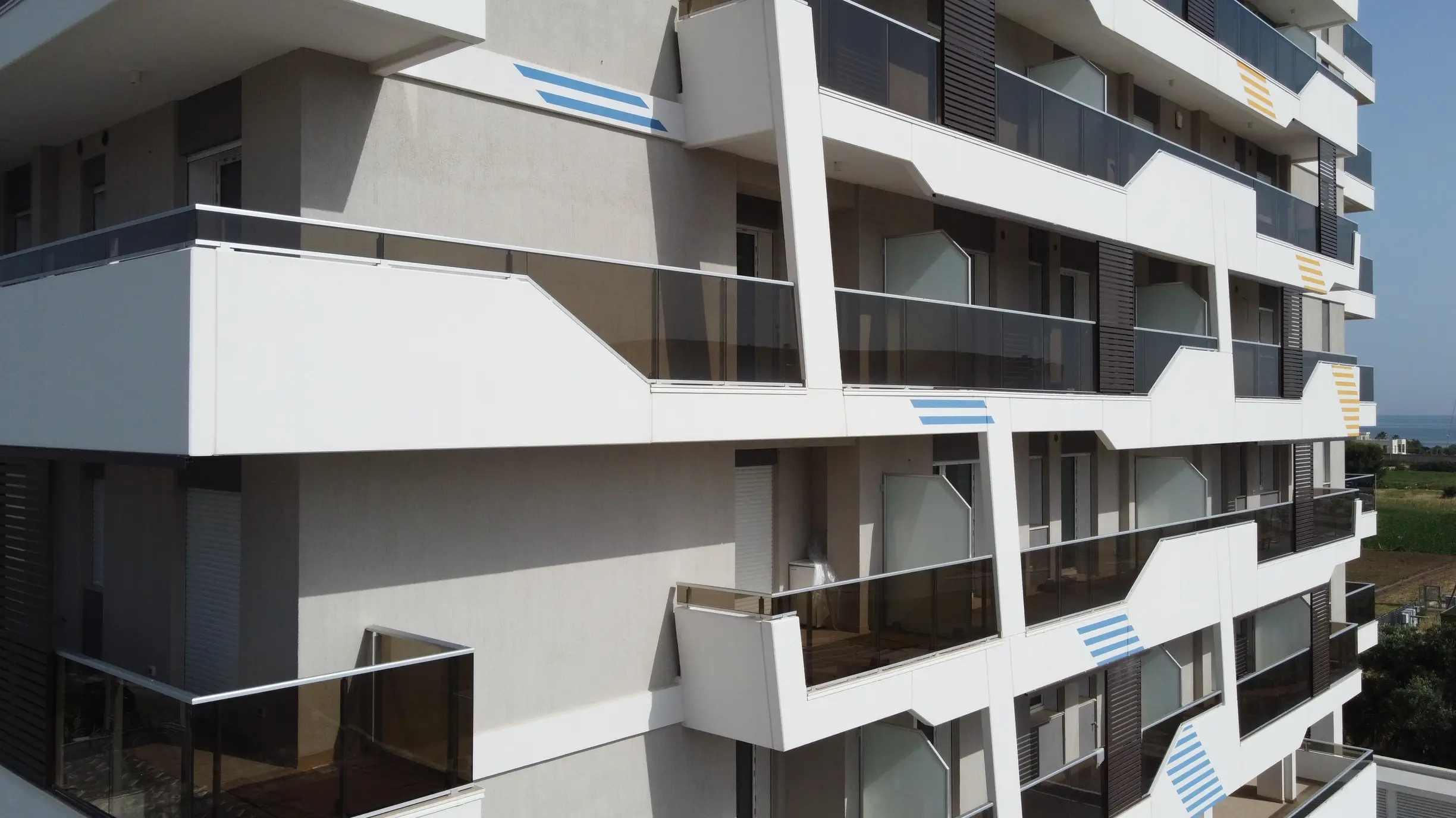“I colori chiari in facciata aiutano la riflessione dei raggi solari così da evitare il surriscaldamento delle murature. Anche la scelta della texture DROP della linea KREATIV non è solo legata all’estetica” spiega l’architetto Paterno, “la finitura irregolare della texture in facciata ha permesso di ottenere una migliore schermatura dei raggi solari, con un gioco di luci e ombre che anch’esso concorre ad evitare il surriscaldamento.” L’irraggiamento del sole è stato oggetto di uno studio approfondito, che tiene conto delle diverse posizioni in cui il sole illumina l’edificio. Lo studio sul soleggiamento ha costituito anche lo spunto per il decoro con bande azzurre che delineano il percorso del sole durante l’inverno e di bande gialle che riproducono il movimento del sole durante l’estate.