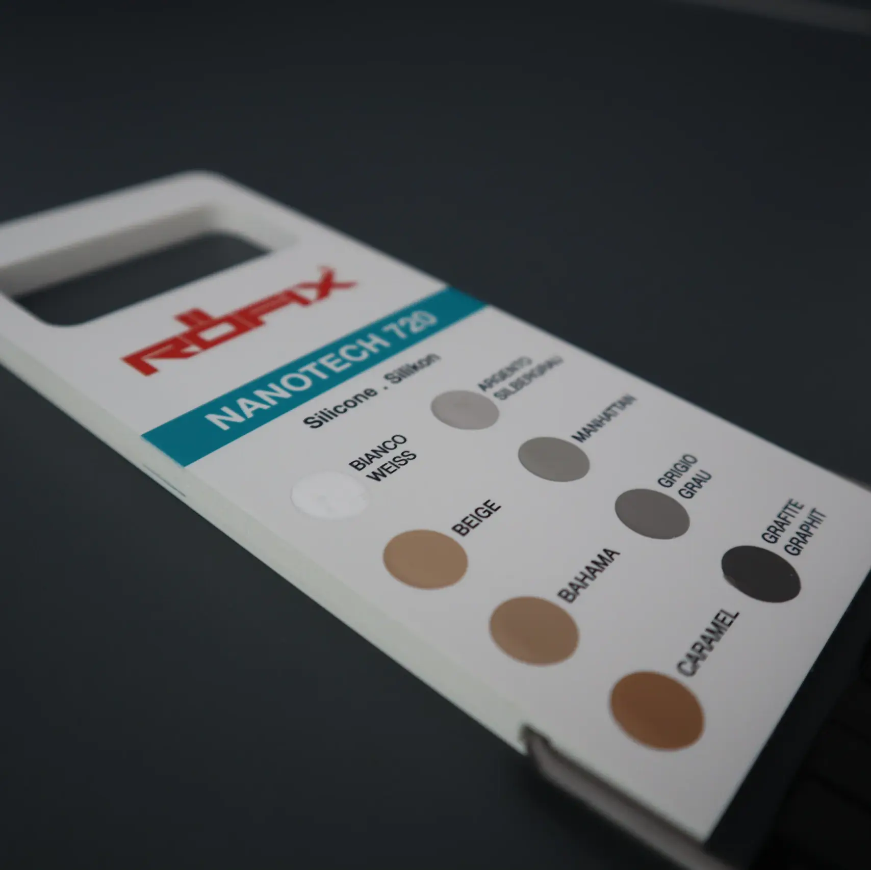 Otto sono le tonalità scelte per gli 8 listelli della cartella RÖFIX Nanotech 730 stucco cementizio flessibile, e sempre otto sono gli avvallamenti rotondi stuccati con RÖFIX Nanotech 720 silicone. Gli 8 colori richiamano le nuance più ricercate e moderne: Grafite, Grigio, Manhattan, Argento, Caramel, Bahama, Beige, Bianco.